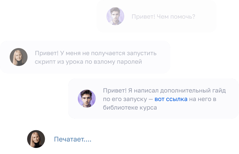 Ваши задания проверяют практикующие специалисты по ИБ с опытом от 5 лет. Они укажут на ошибки, подскажут, как их исправить и что можно улучшить. В общем чате вы сможете задать вопрос в любое время
